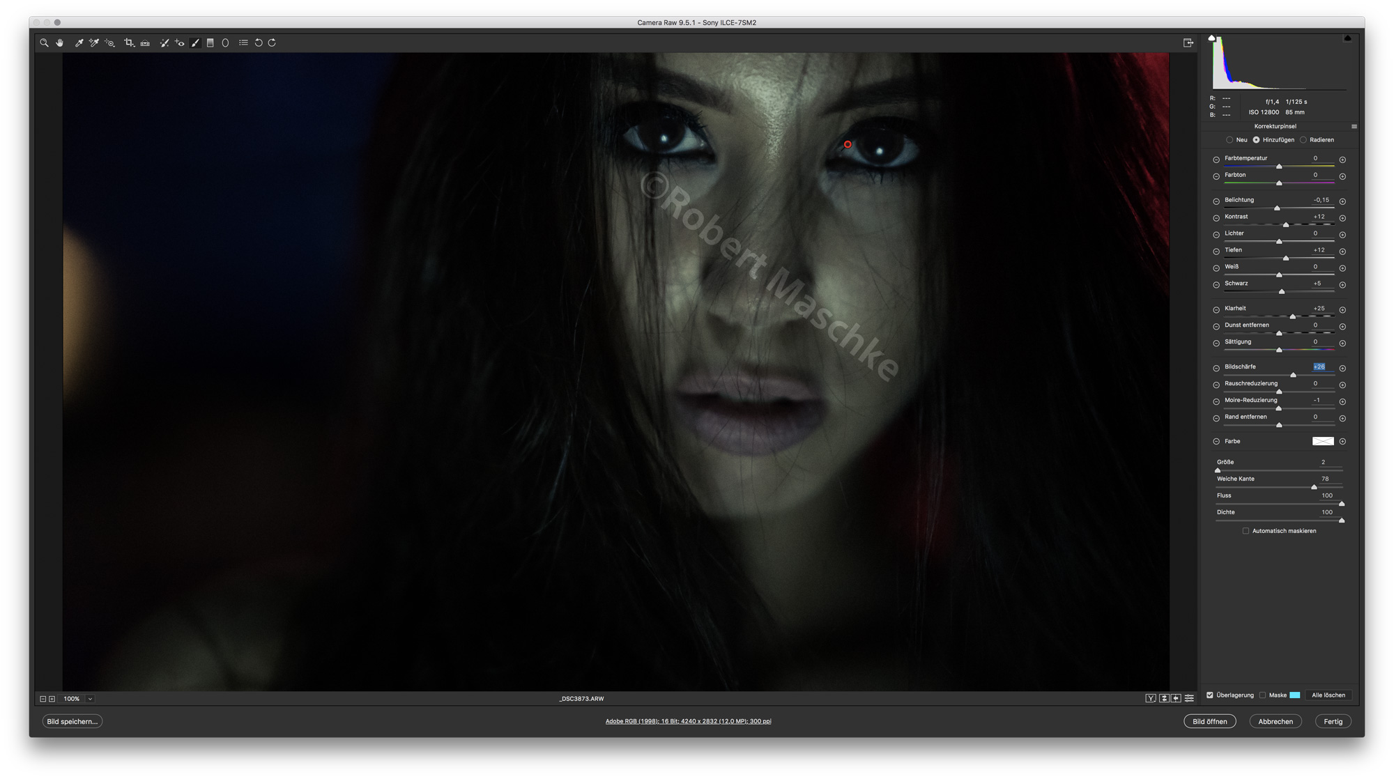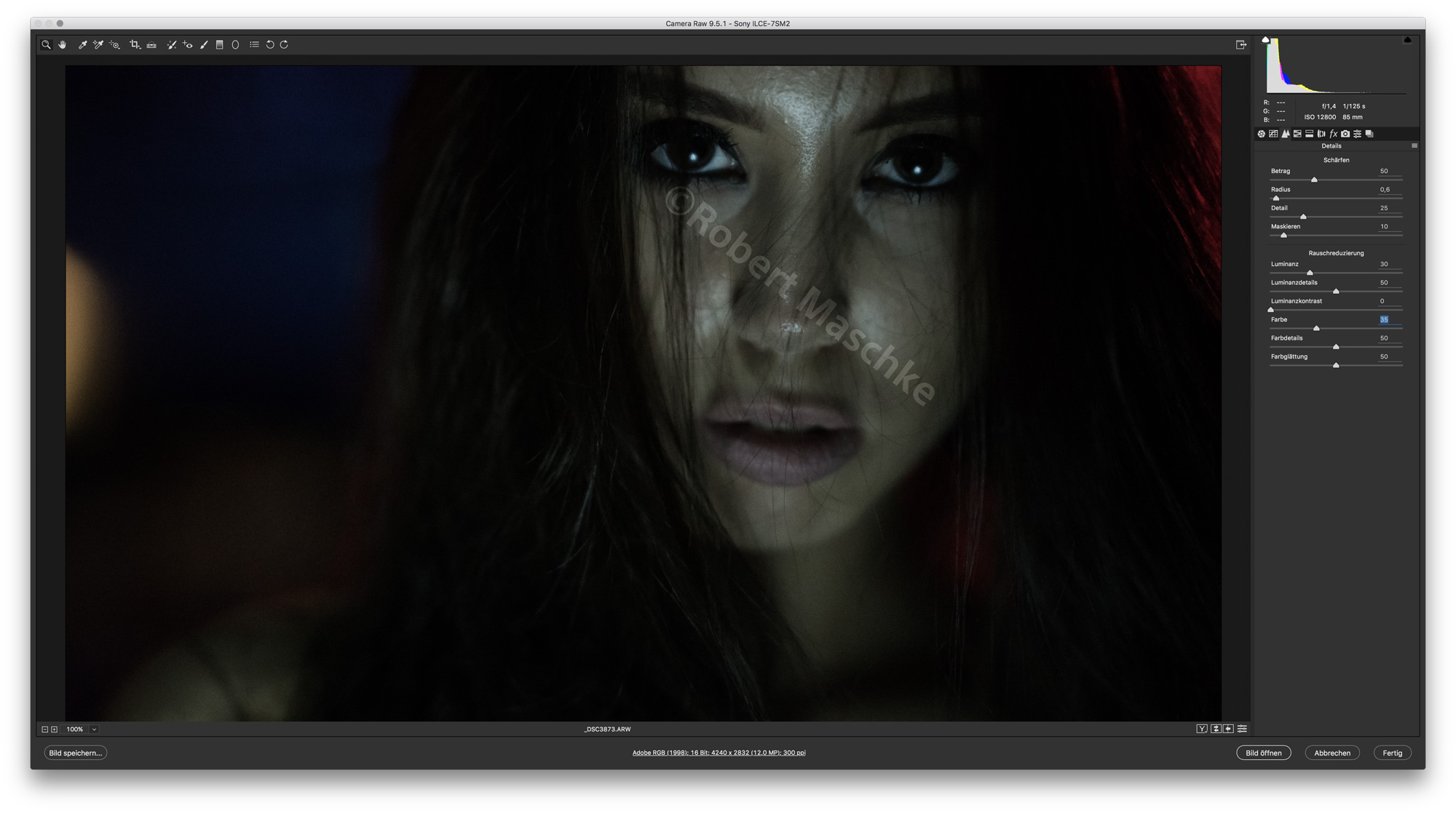 Wer viel Low Light fotografiert und keine A7S zur Verfügung hat, weiß, dass Rauschen bei der Bildbearbeitung ein Thema ist. Um das Rauschen nicht noch stärker zu betonen, schärft Robert nur dezent nach. Umgekehrt eliminiert er aber auch nicht das gesamte Rauschen.