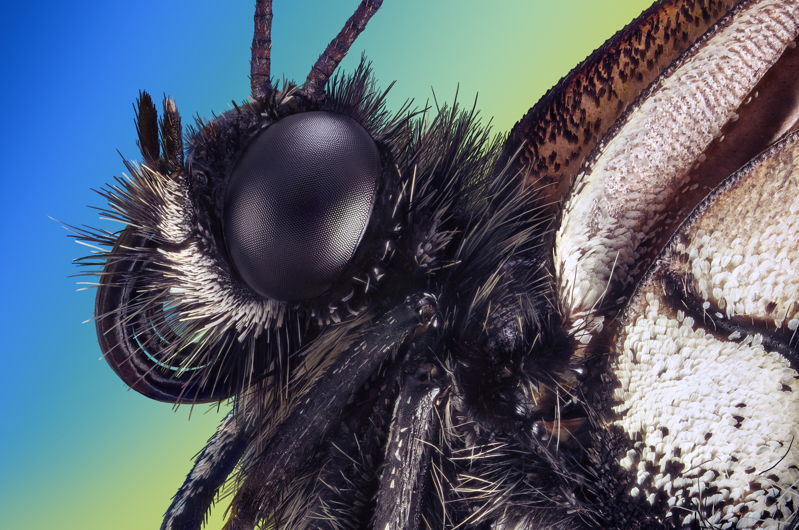 An extreme macro portrait of a black-veined white butterfly (Aporia crataegi) taken with two lenses MC Jupiter-37A 135mm f/3,5, which was made in 1985, and a retro lens Zenitar-M 1,7/50, made in 1982, as one lens